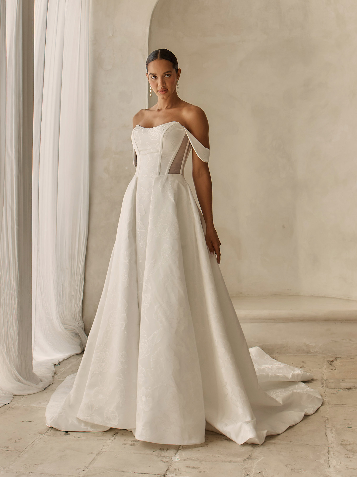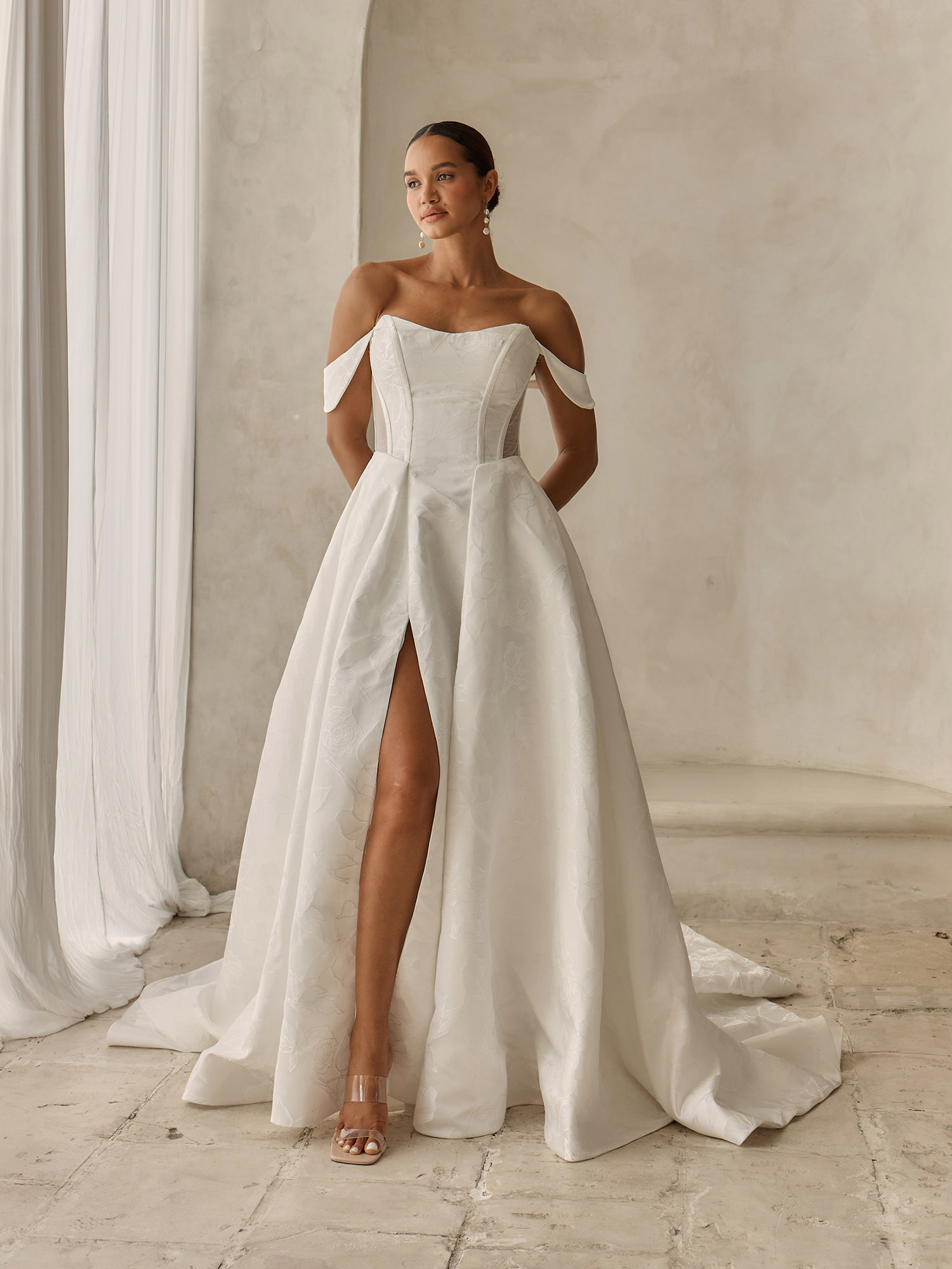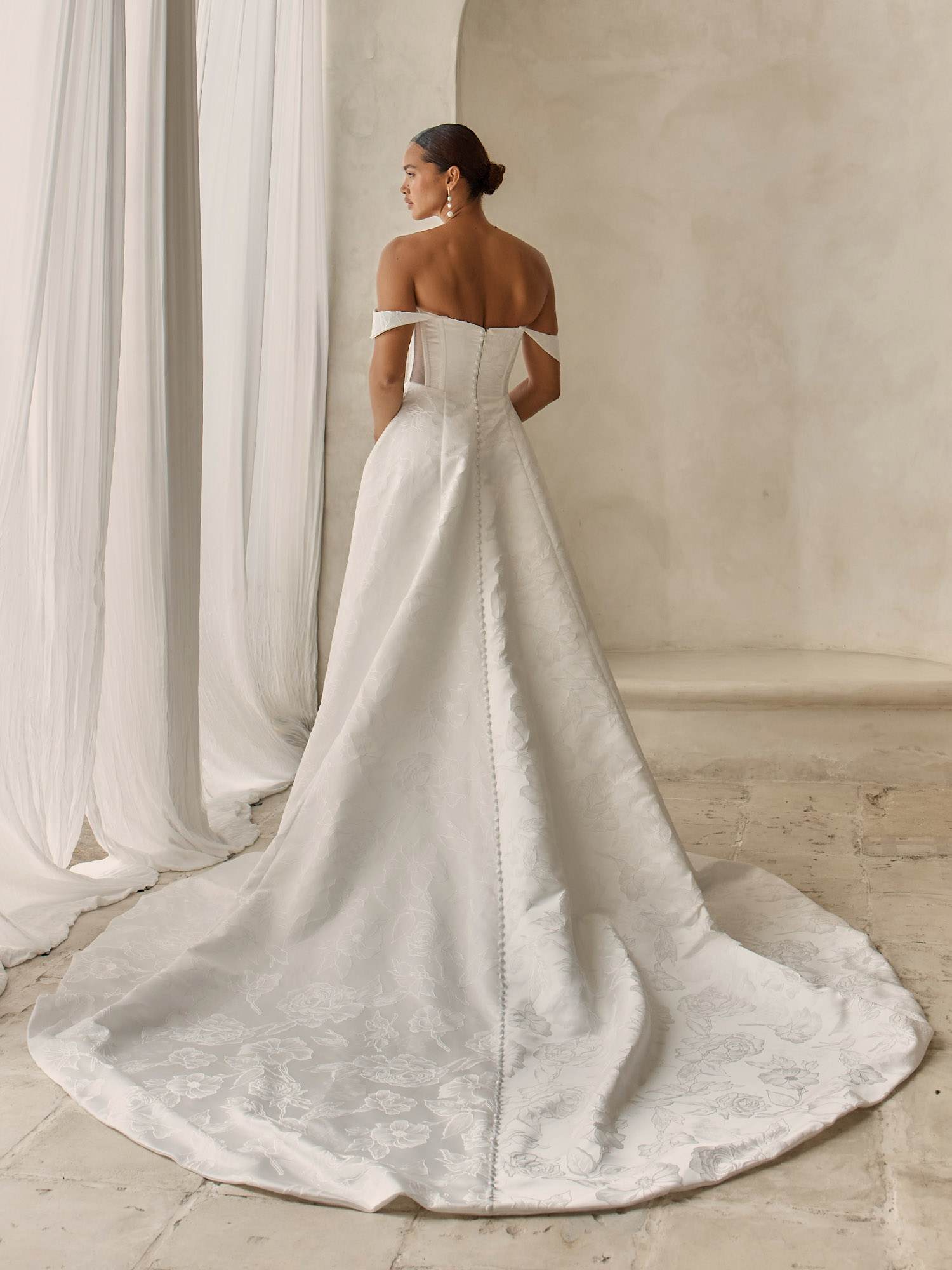 Das Brautkleid JOSH ist eine moderne Interpretation klassischer Brautkleider und aus luxuriösem floralem Jacquard oder cleanem Satin gefertigt.