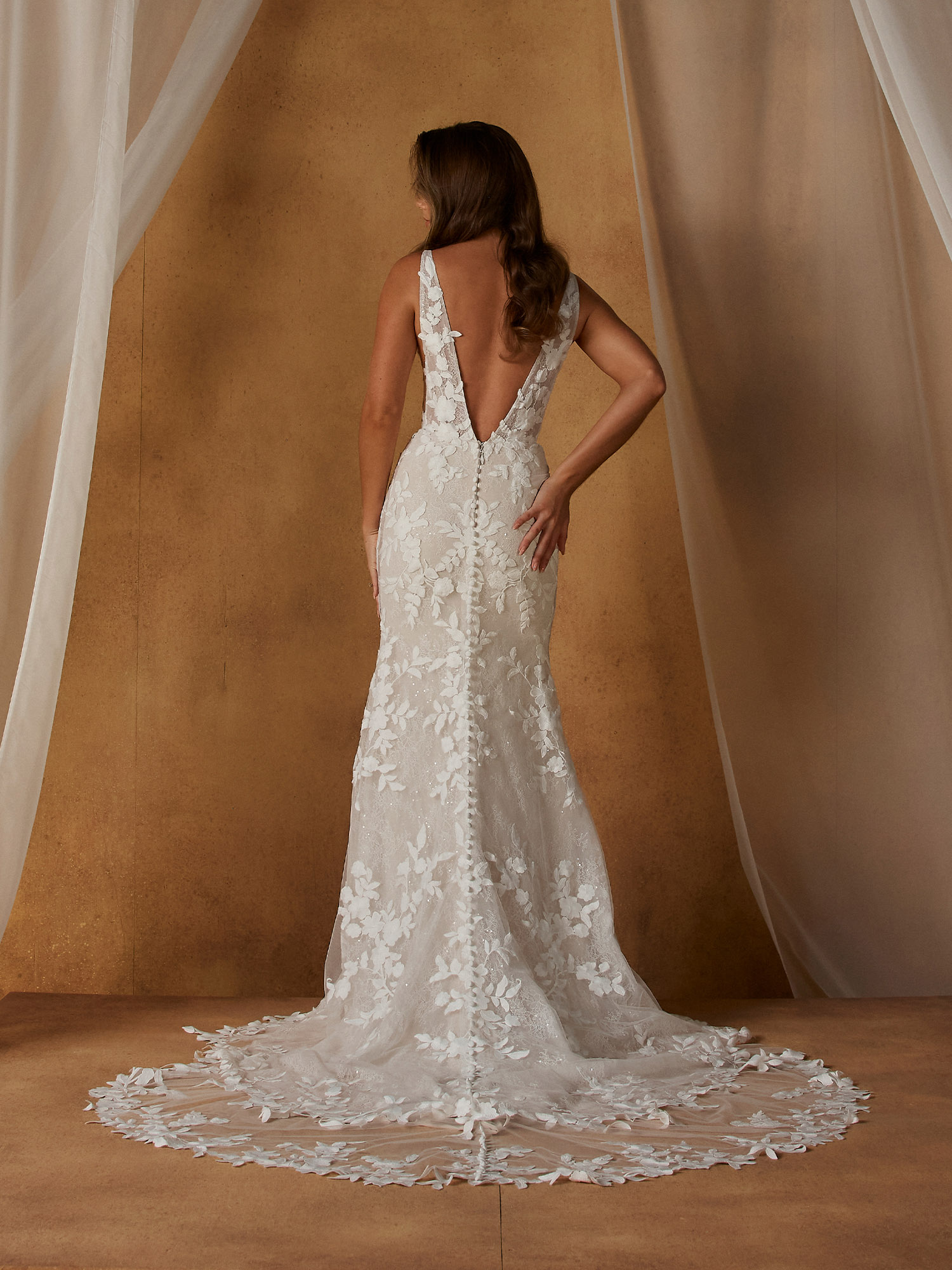 Am Rücken schließt sich ein V-förmiger Ausschnitt ab, der mit vertikalen Knöpfen entlang der gesamten Schleppe verziert ist und so für ein elegantes und raffiniertes Finish sorgt.