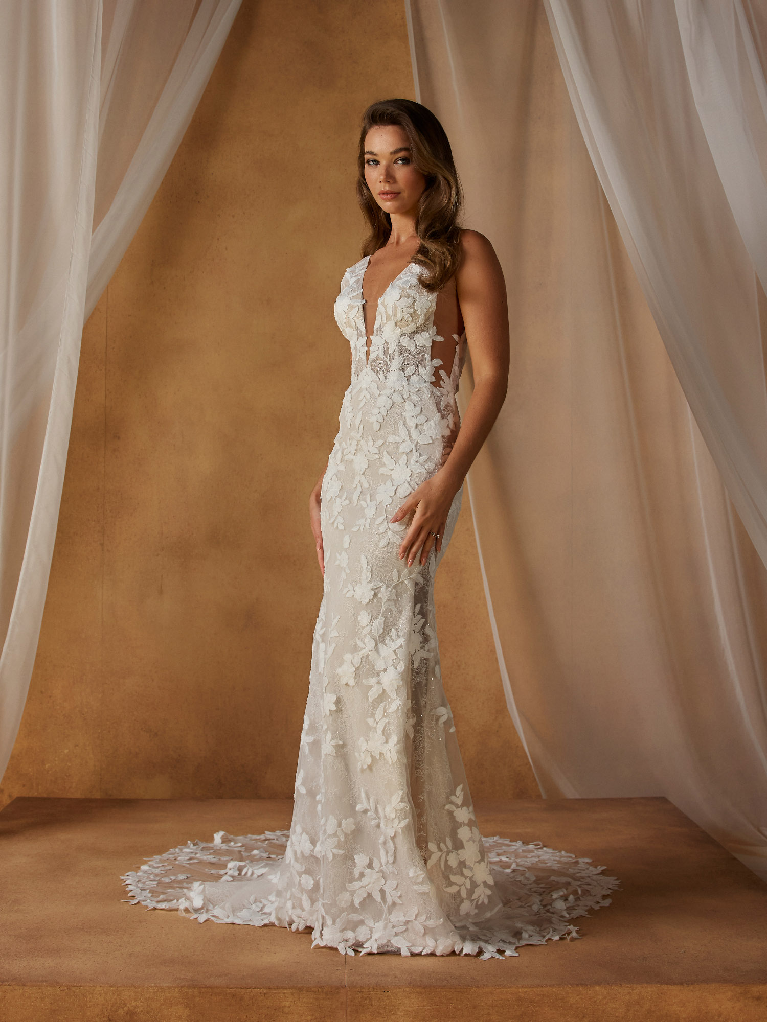 Das Brautkleid NELLIE zelebriert moderne Romantik mit einer eleganten Fit-and-Flare-Silhouette, perfekt für Bräute, die skulpturale Linien und subtilen Schimmer lieben.