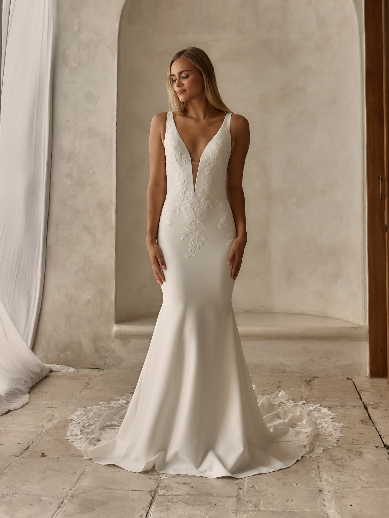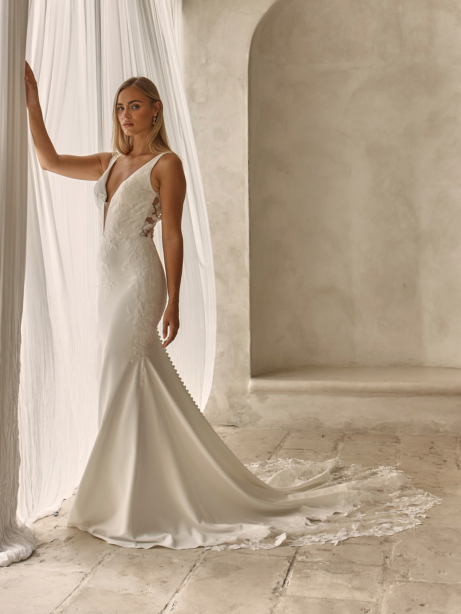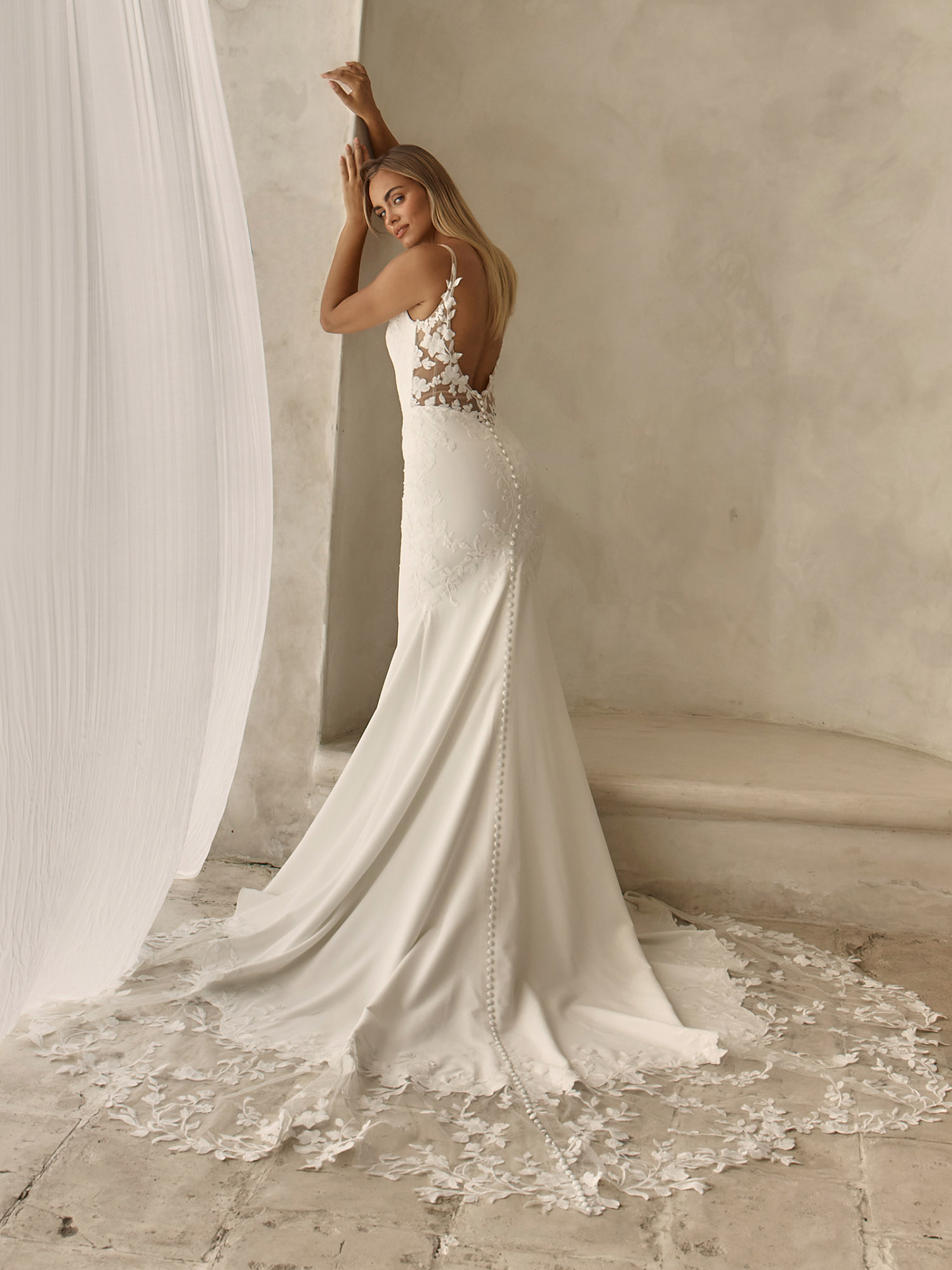 Das Brautkleid TAI ist für die minimalistische Braut entworfen, die sich einen modernen und zugleich zeitlosen Look wünscht. Es ist aus feinem Crêpe gefertigt und mit zarten Stickereien verziert, die dem Kleid eine weiche und romantische Note verleihen.